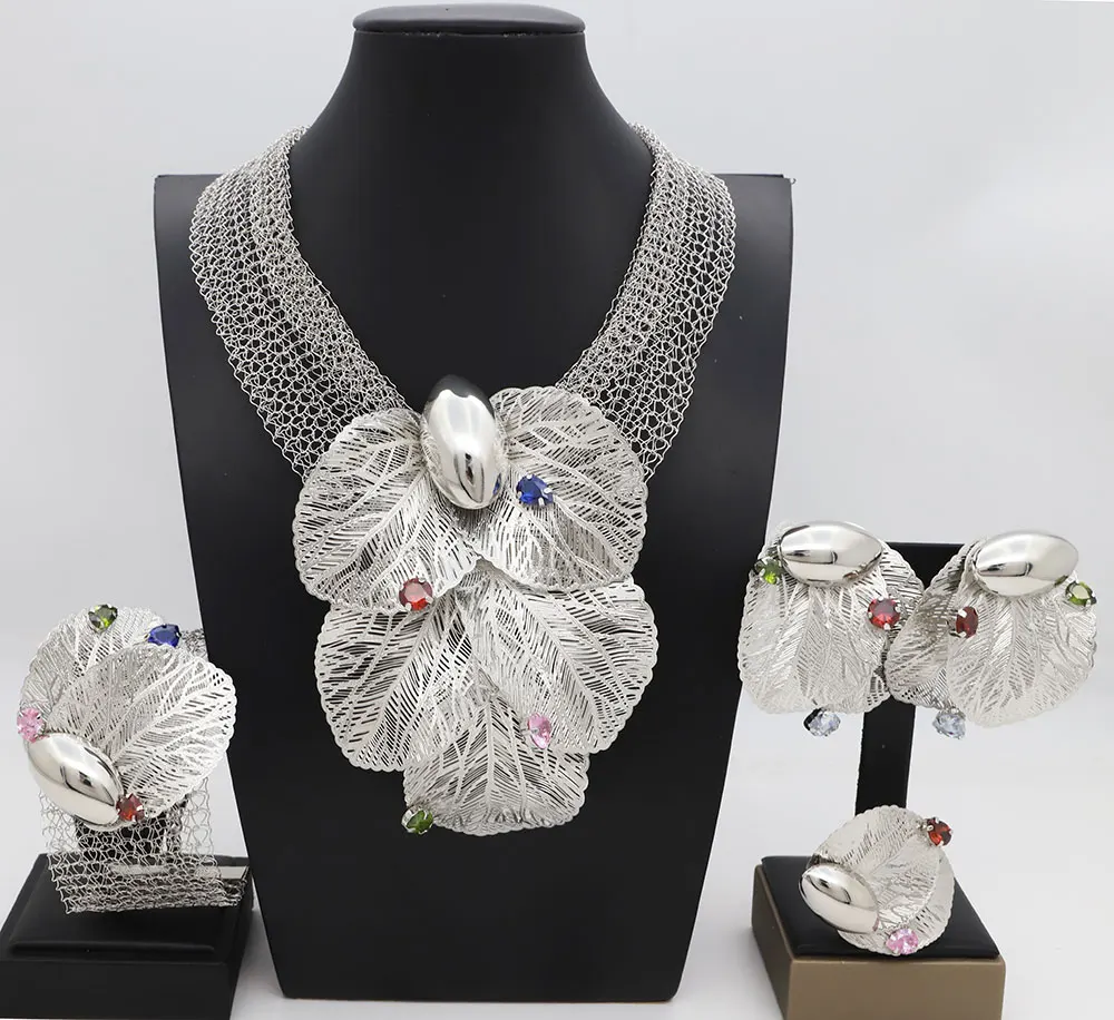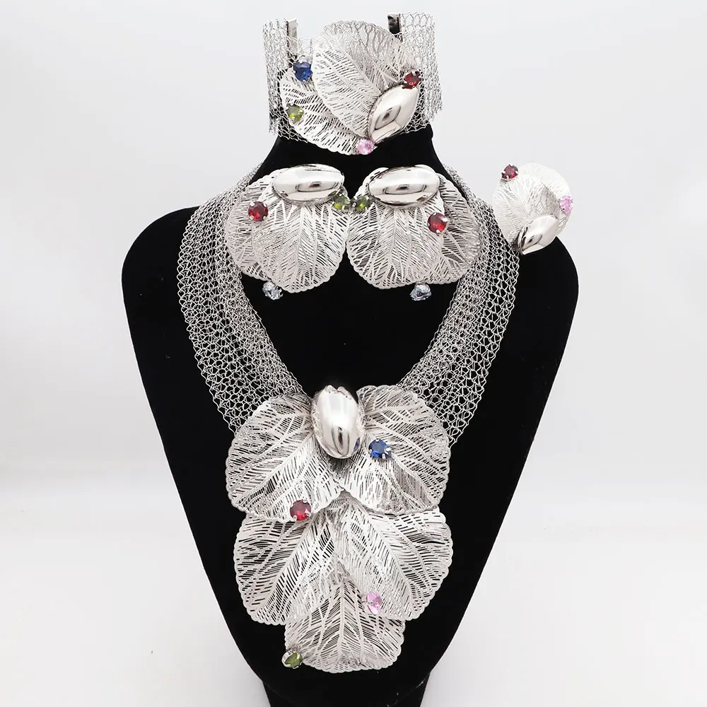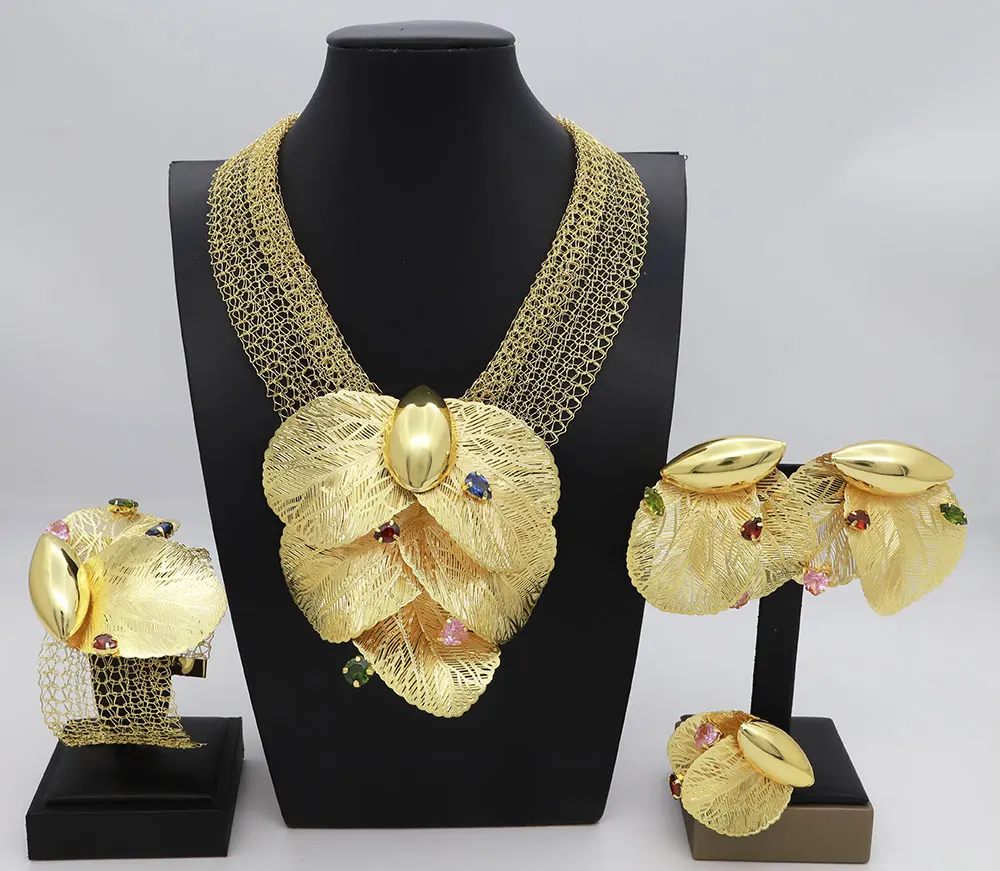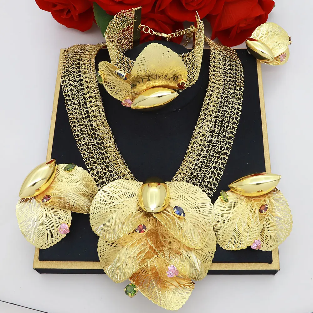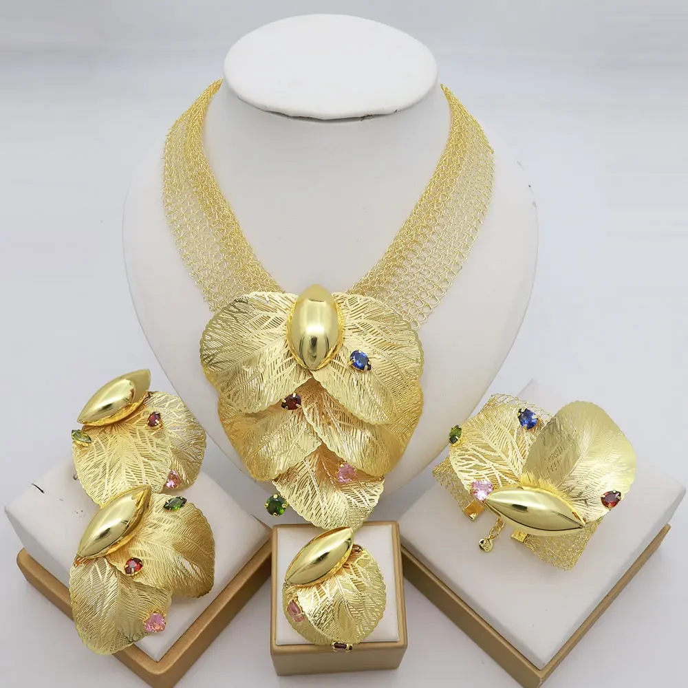 Dubai 18k Gold Plated Women Jewelry Set Colorful Leaf Pendant Created Stone Necklace Nigerian Wedding Bijoux Gold Jewelry Set